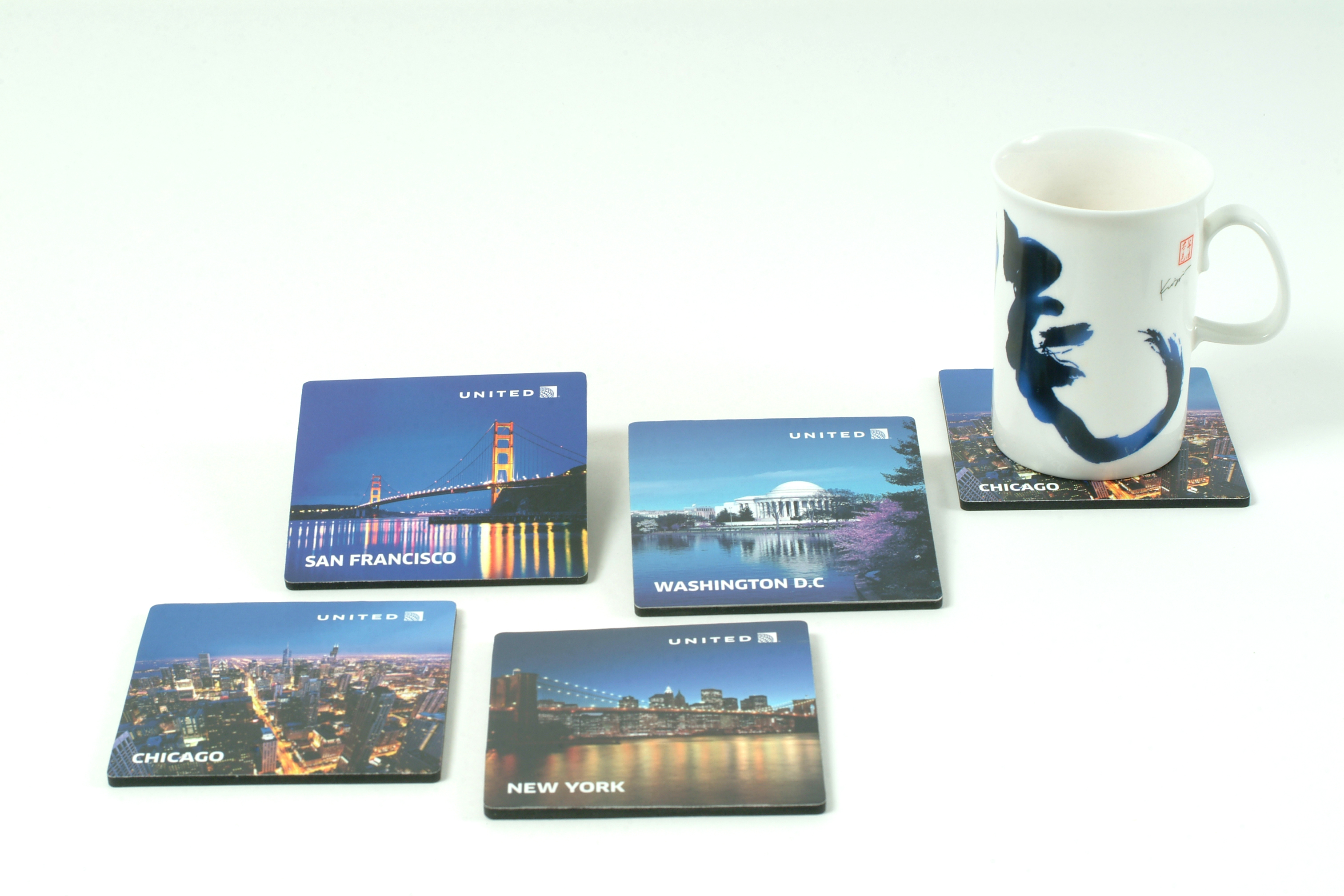 • 說  明︰以舊金山、芝加哥、華盛頓D.C、紐約四個美國大城市的街景圖做為杯墊的主視覺,來推廣主要航線,將企業推廣的訊息與贈品相結合。