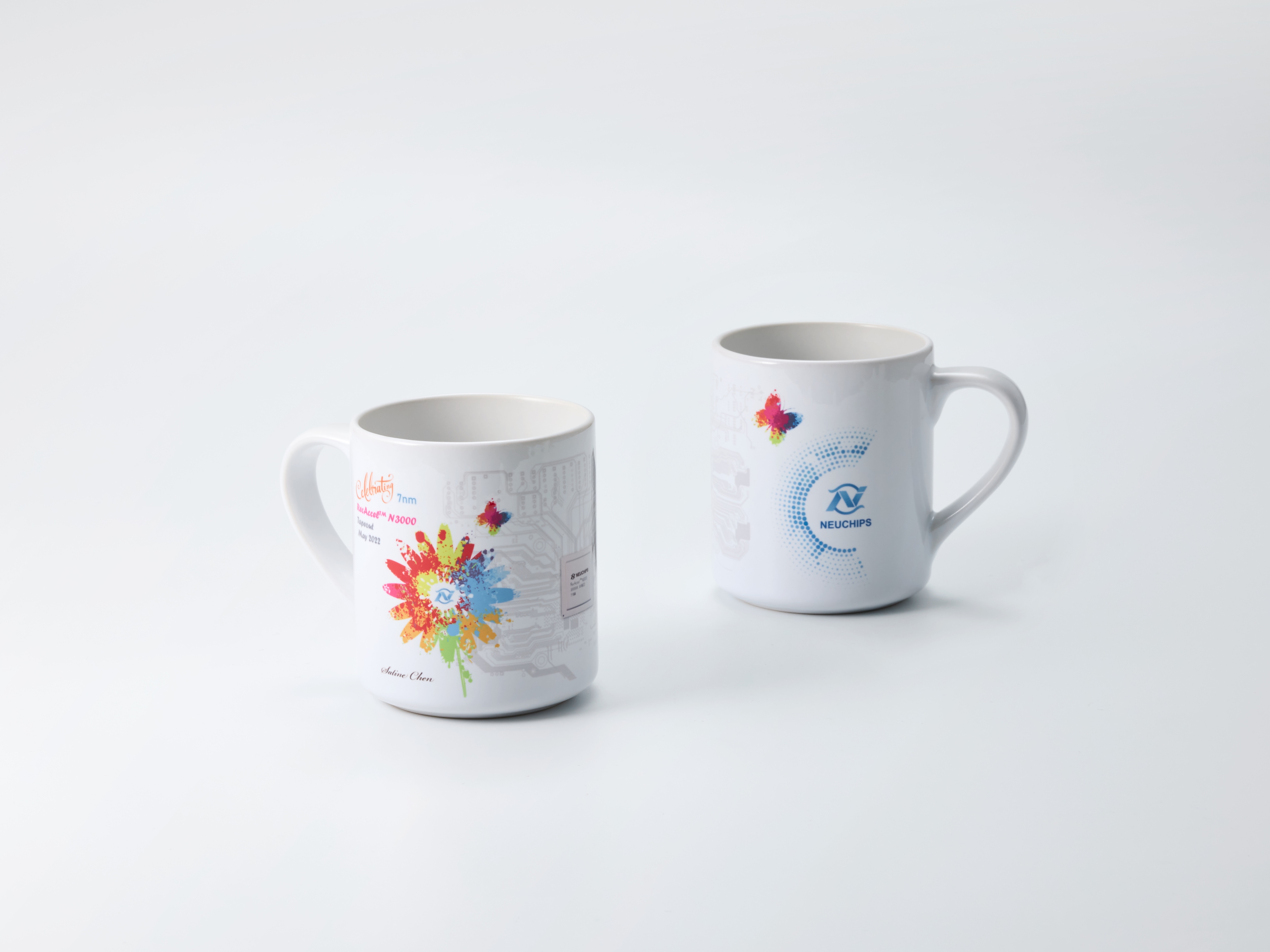 • 說  明︰為了慶祝晶片設計量產,為客戶設計一款紀念馬克杯,將晶片圖案及VIP的姓名都放入設計元素中,以熱轉印方式印製。