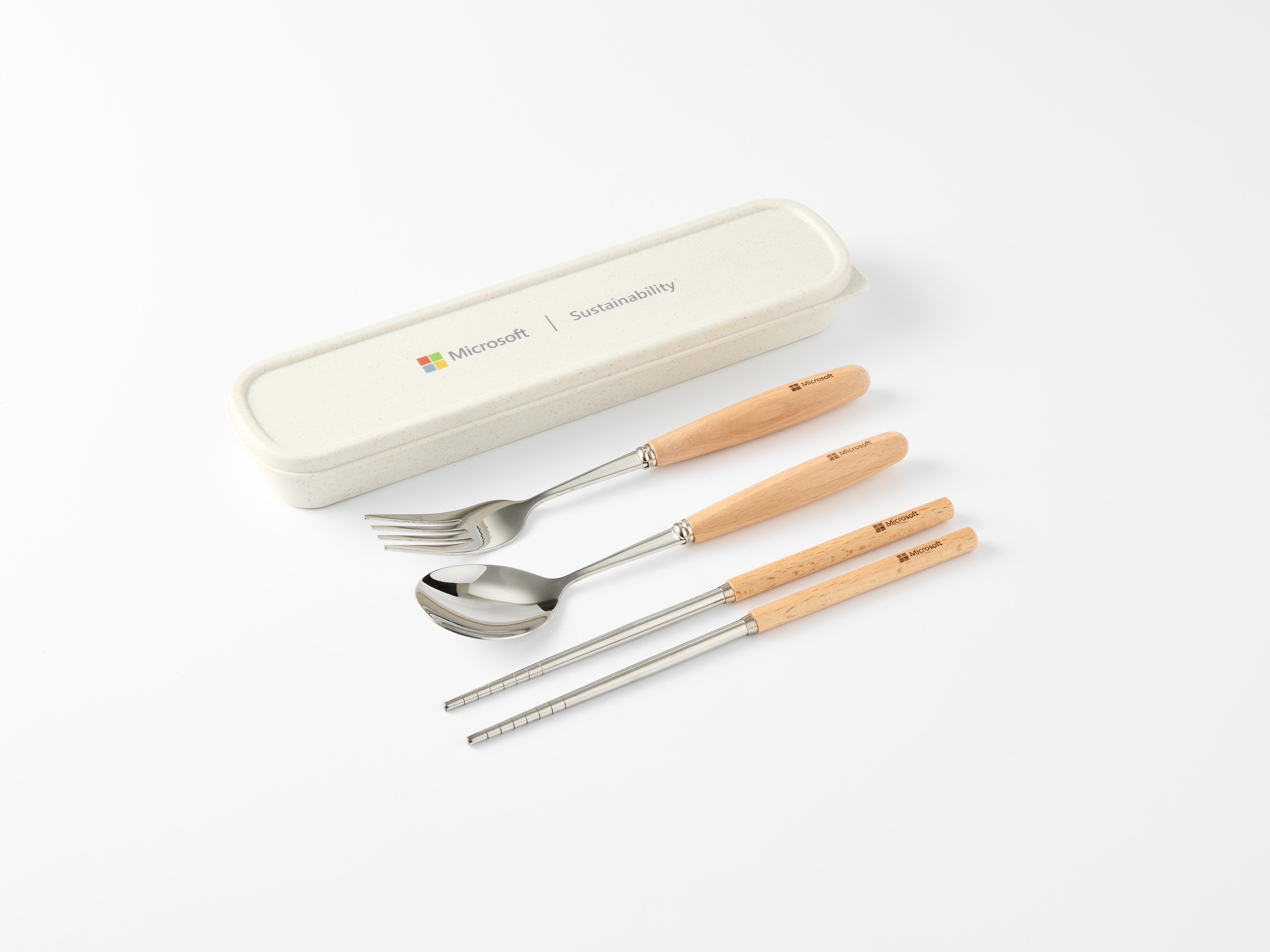 • 說  明︰將環保,融入日常每一餐。這款微軟聯名永續餐具組,選用304不鏽鋼餐具搭配天然木柄,質感溫潤,實用耐用。外盒則使用小麥秸稈纖維複合材質製成,不含塑化劑、減少塑膠使用,是真正從源頭守護環境的好選擇。 盒面印有「Microsoft | Sustainability」品牌識別,簡潔有力地傳遞企業的永續態度,極適合用於企業行銷、公關贈品或ESG倡議禮。