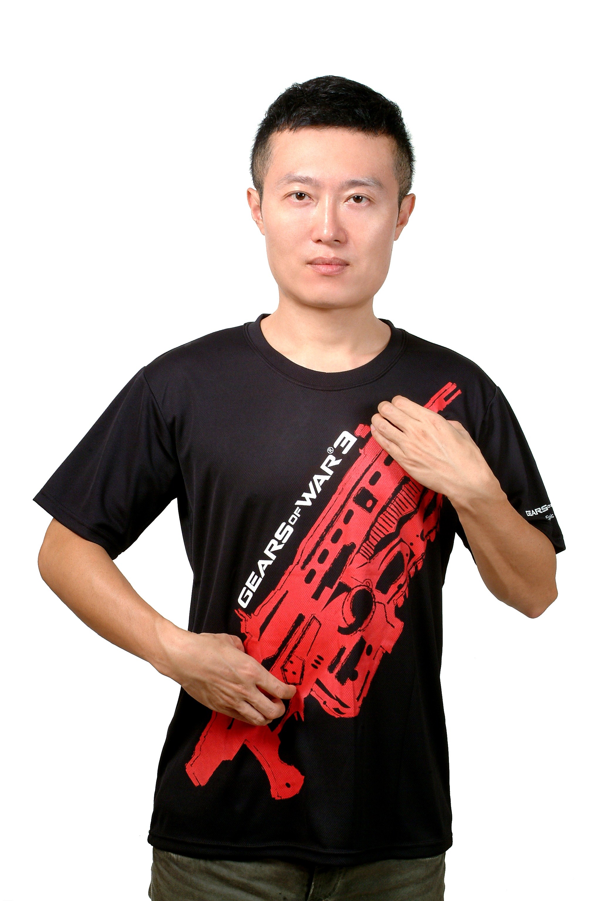 • 說  明︰台灣微軟為推廣XBOX 360熱門遊戲『GEARS of WAR』,特訂製此款造型酷炫的T恤,重新繪製的機關槍圖案,搭配黑色單面排汗布製作,質地吸汗散熱即使在酷夏中也不怕嚴熱,布料及車工全採用台灣MIT認證廠製作。