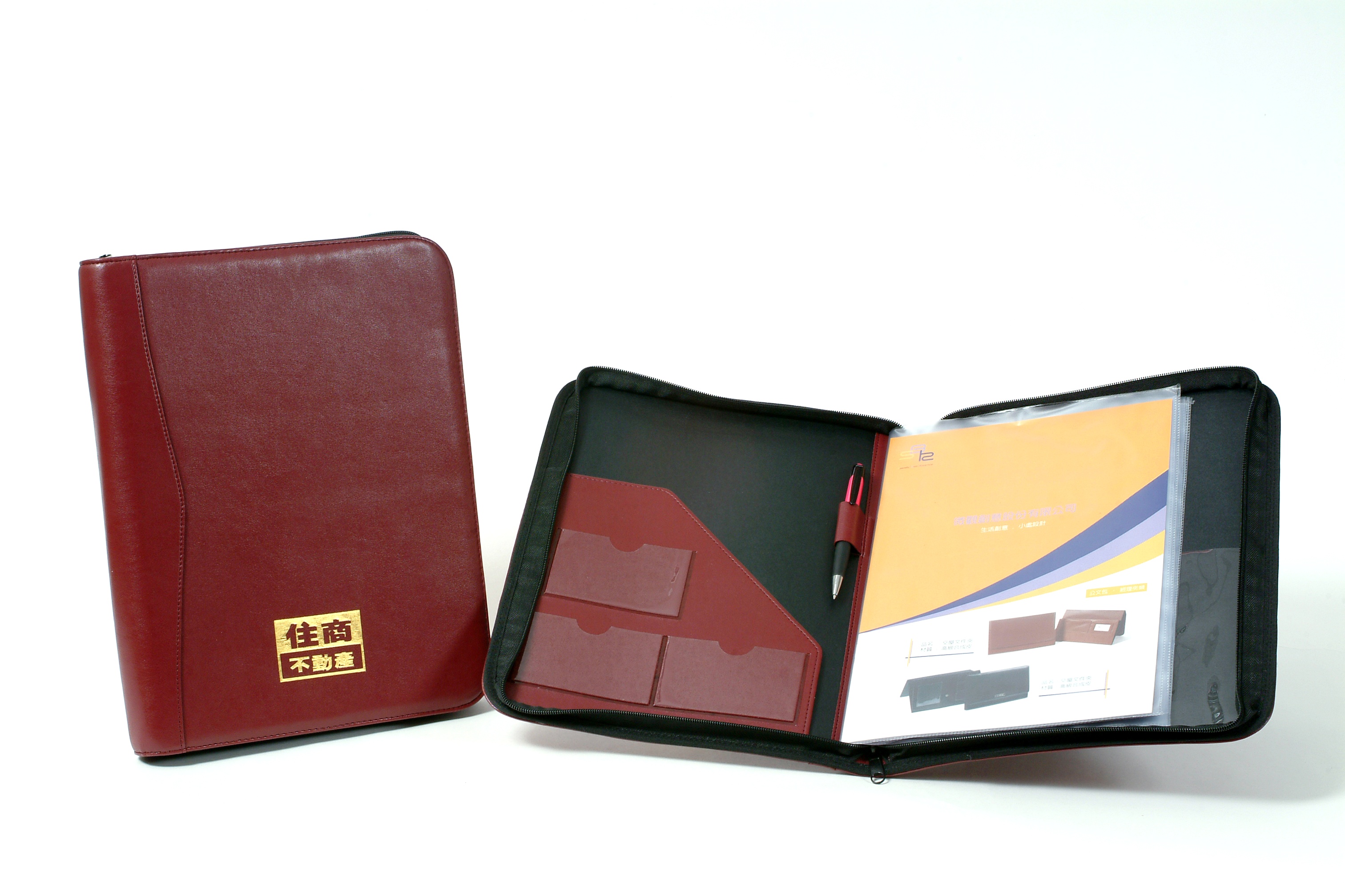 • 說  明︰『住商不動產』新生加盟店委請『微觀創意』重新設計成交夾,以拉鍊開合的方式來取代原先書本式的開合方式,避免文件掉落,並改變其皮料,讓烙印的效果更突出,其他部份遵照客戶的需求保留原隔層方式及材質,以控制製作的成本。
