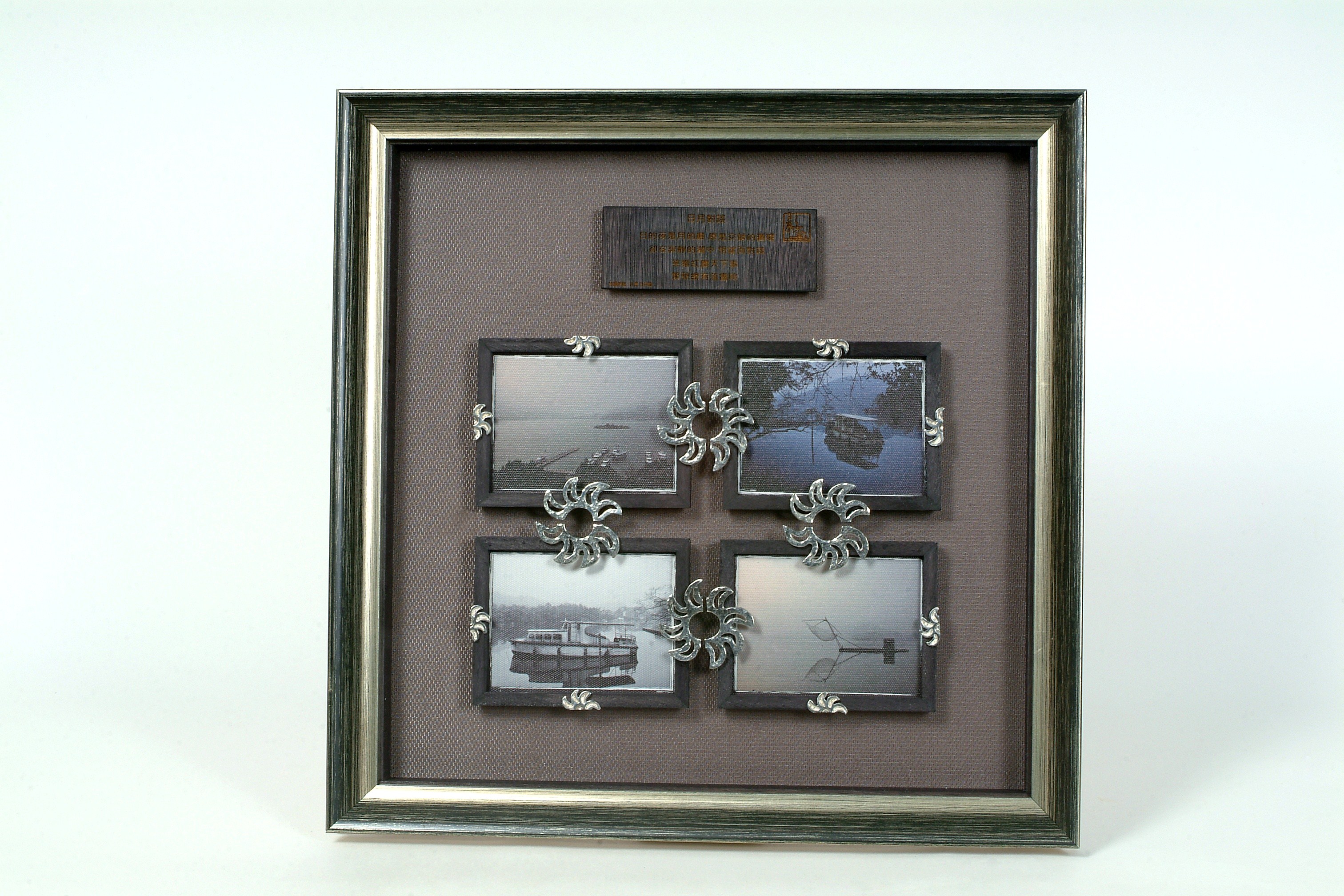 - 說 明︰『日的夜是月的晨 原是交錯的循環 卻在寂靜的湖中 相望而對談 笑看紅塵天下事 繁華總有落盡時』 將日月潭的宛如圖畫山水,氤氳水氣及層次分明的山景變化 設計成如同拼圖式的風景匯集 並用純銀金工設計日月合體的圖案 如同轉動風車更恰似一輪飛揚的烈日 售價:依需求數量及製作大小報價 全球製作數量:300幅 (本系列作品亦接受客戶指定拍攝地點或選擇圖庫中的圖片重新製作,並以拍攝內容做客製化金工設計及裱褙服務,每幅價位依專案內容報價)