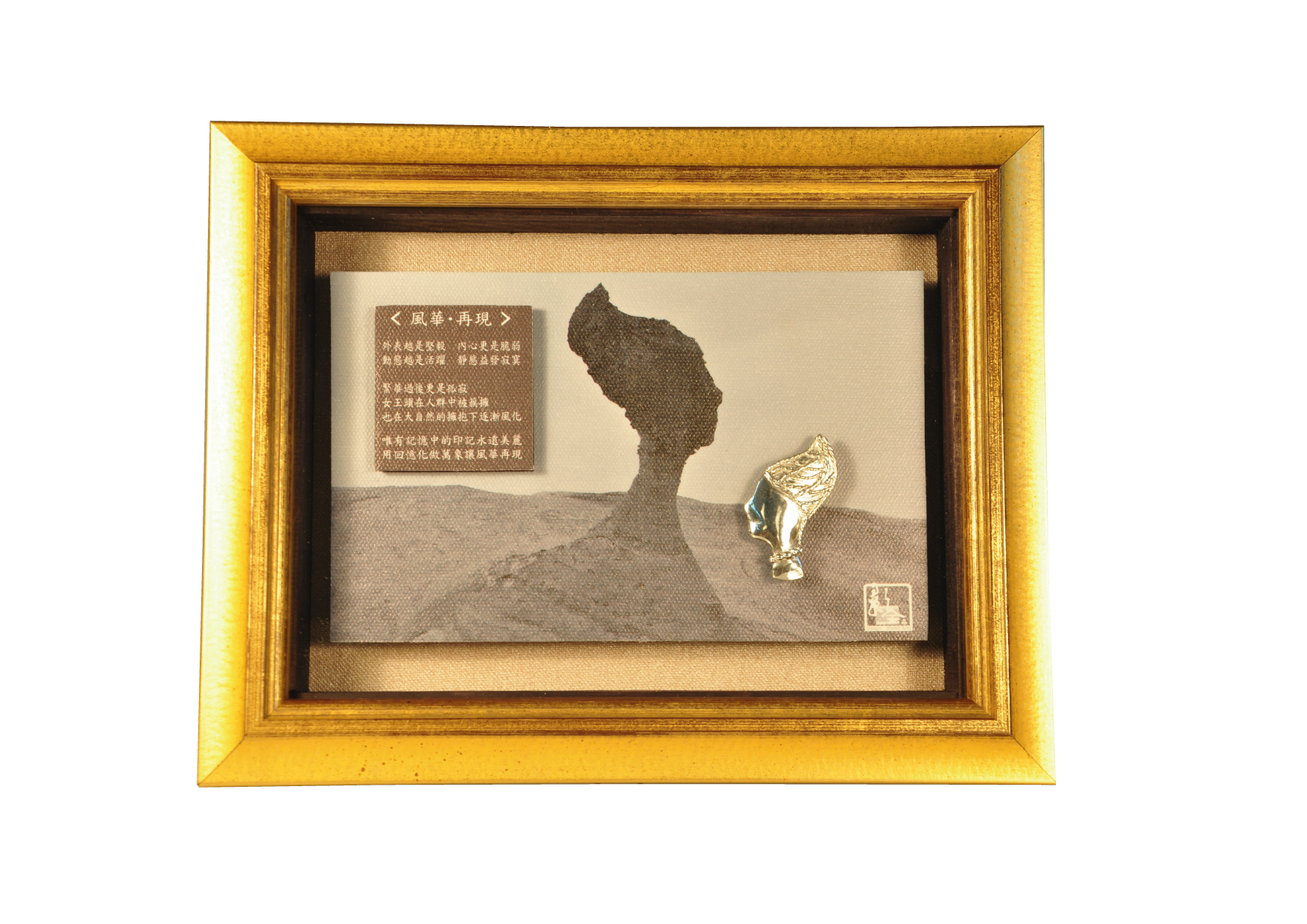 • 說  明︰『如水墨的潑灑 造就山的朦朧 如上天的恩賜 造就日月的相逢 在湖中相依相映』 將日月潭的宛如圖畫山水,氤氳水氣及層次分明的山景變化 設計成如同拼圖式的風景匯集 並用純銀金工設計日月合體的圖案 如同轉動風車更恰似一輪飛揚的烈日 售價:依需求數量及製作大小報價 全球製作數量:300幅 (本系列作品亦接受客戶指定拍攝地點或選擇圖庫中的圖片重新製作,並以拍攝內容做客製化金工設計及裱褙服務,每幅價位依專案內容報價)