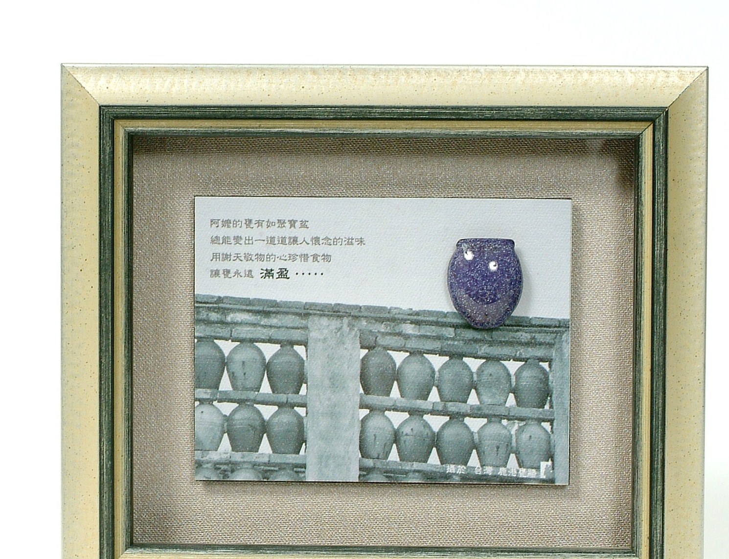 - 說 明︰『如水墨的潑灑 造就山的朦朧 如上天的恩賜 造就日月的相逢 在湖中相依相映』 將日月潭的宛如圖畫山水,氤氳水氣及層次分明的山景變化 設計成如同拼圖式的風景匯集 並用純銀金工設計日月合體的圖案 如同轉動風車更恰似一輪飛揚的烈日 售價:依需求數量及製作大小報價 全球製作數量:300幅 (本系列作品亦接受客戶指定拍攝地點或選擇圖庫中的圖片重新製作,並以拍攝內容做客製化金工設計及裱褙服務,每幅價位依專案內容報價)